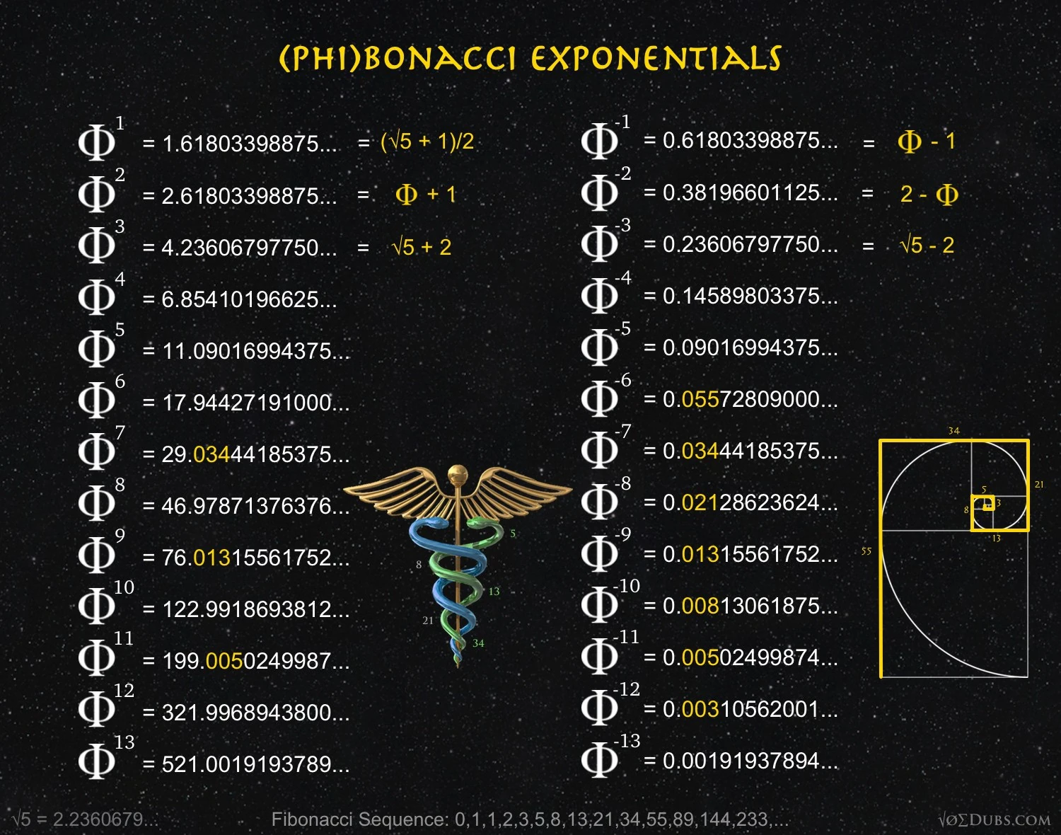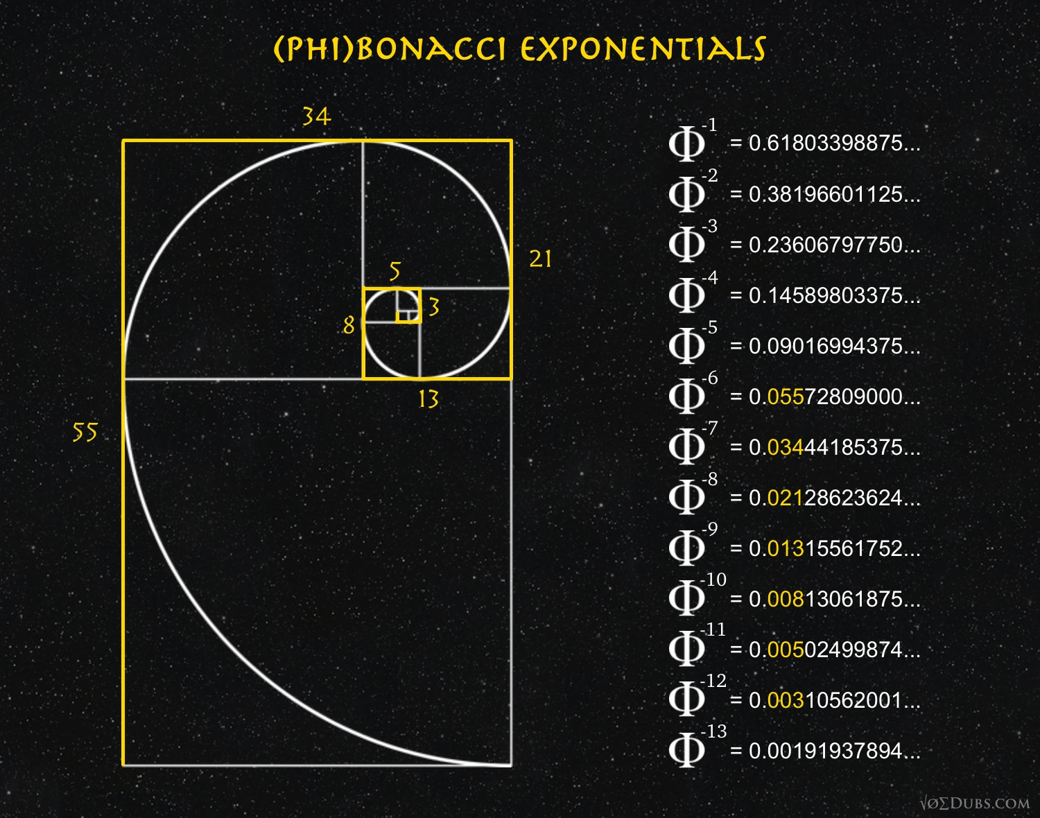 The Fibonacci series was hidden in Phi this whole time! The first one to pop out at you, is of course, phifty phive. If your math is rusty, an exponent is just the number multiplied by itself. Phi to the third power is 1.6 x 1.6 x 1.6. Phi to the negative third power would be 1 divided by (1.6 x 1.6 x 1.6). By analyzing these exponentials, the mystery of ø reveals itself.