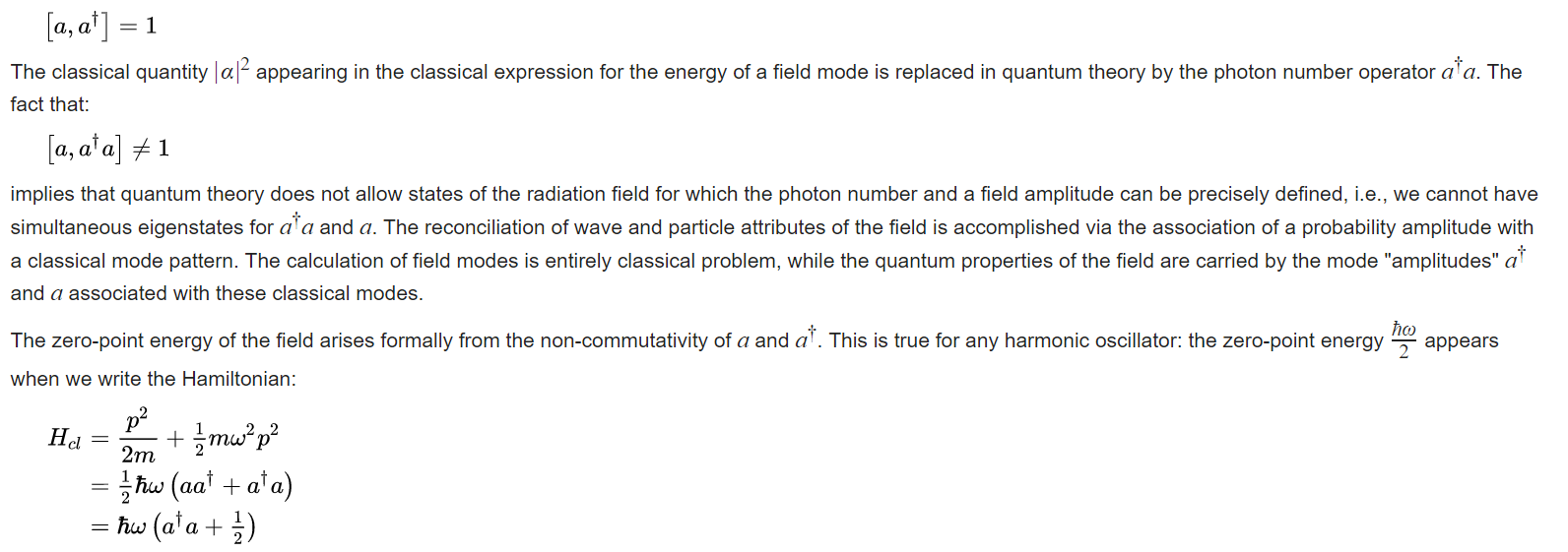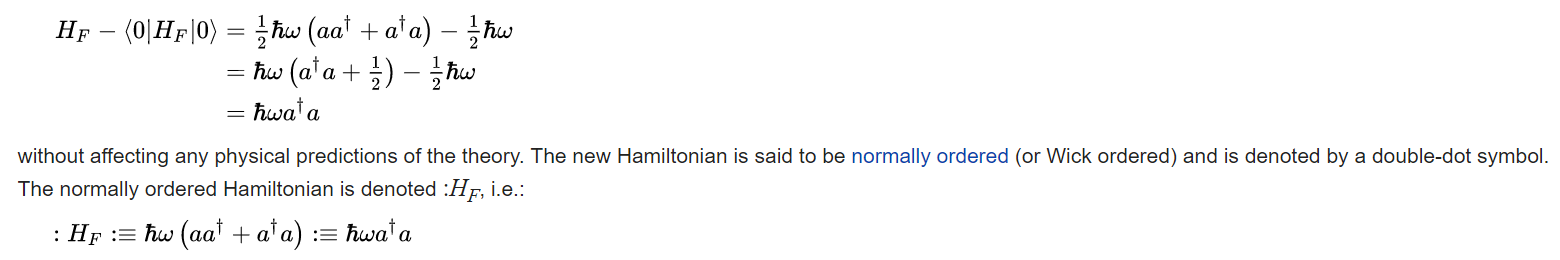 In other words, within the normal ordering symbol we can commute a and a†. Since zero-point energy is intimately connected to the non-commutativity of a and a†, the normal ordering procedure eliminates any contribution from the zero-point field. This is especially reasonable in the case of the field Hamiltonian, since the zero-point term merely adds a constant energy which can be eliminated by a simple redefinition for the zero of energy. Moreover, this constant energy in the Hamiltonian obviously commutes with a and a† and so cannot have any effect on the quantum dynamics described by the Heisenberg equations of motion.