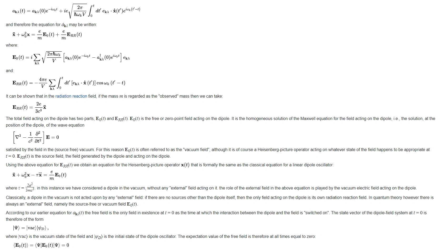 Without the free field E0(t) in this equation the operator x(t) would be exponentially dampened, and commutators like [z(t),pz(t)] would approach zero for t ≫ 1/τω2 0. With the vacuum field included, however, the commutator is iħ at all times, as required by unitarity, and as we have just shown. A similar result is easily worked out for the case of a free particle instead of a dipole oscillator.