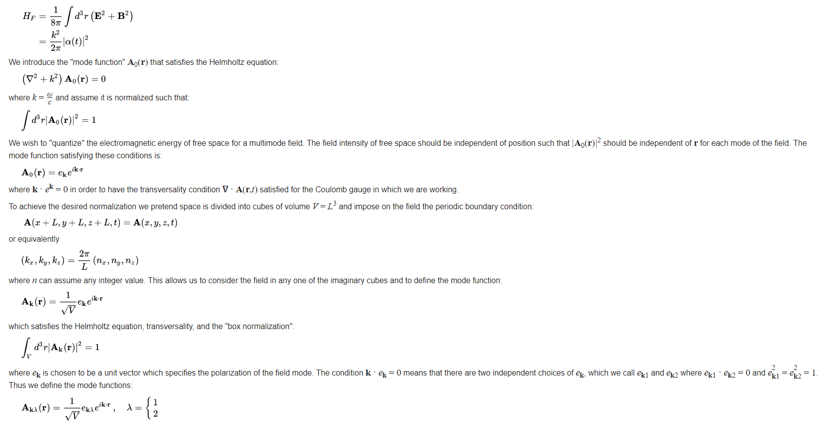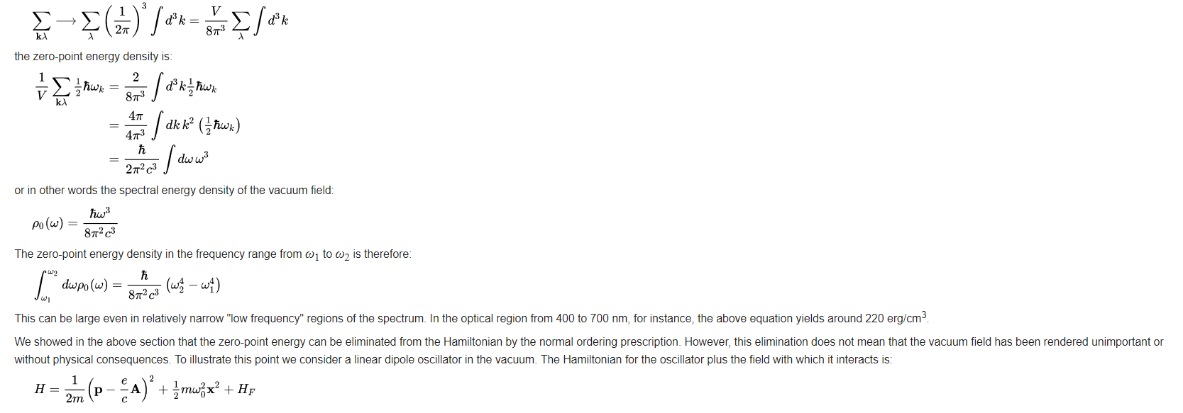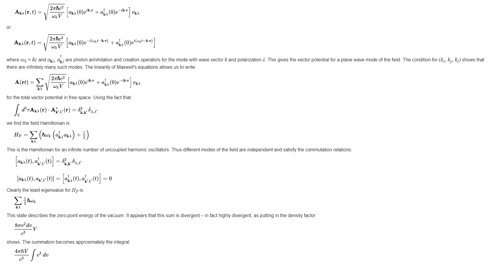 In a process in which a photon is annihilated (absorbed), we can think of the photon as making a transition into the vacuum state. Similarly, when a photon is created (emitted), it is occasionally useful to imagine that the photon has made a transition out of the vacuum state. An atom, for instance, can be considered to be "dressed" by emission and reabsorption of "virtual photons" from the vacuum. The vacuum state energy described by ∑kλ ħωk/2 is infinite. We can make the replacement: